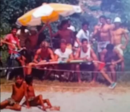 “Túnel do Tempo campeonato de surf na praia da Leste Oeste 1985. Comissão técnica da esquerda para direita Pena,Paulo Barrão, Luciano Pinguelão e Petronio Tavares e eu na Locução Aluisio Gambino.”